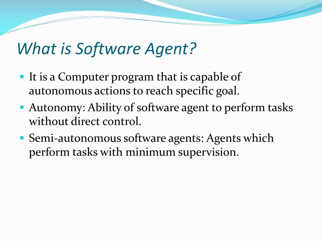 What is Software Agent? • It is a Computer program that is capable of autonomous actions to reach specific goal. • Autonomy: Ability of software agent to perform tasks without direct control. • Semi-autonomous software agents: Agents which perform tasks with minimum supervision.