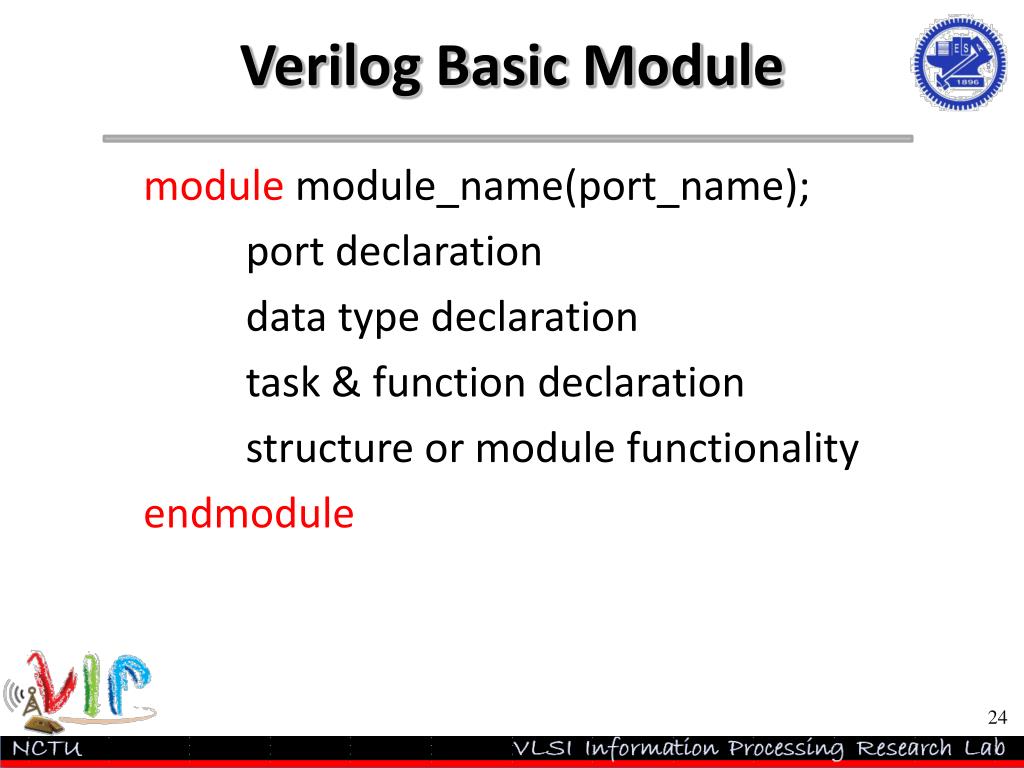 Verilog Basic Module module module_name(port_name); port declaration data type declaration task & function declaration structure or module functionality endmodule