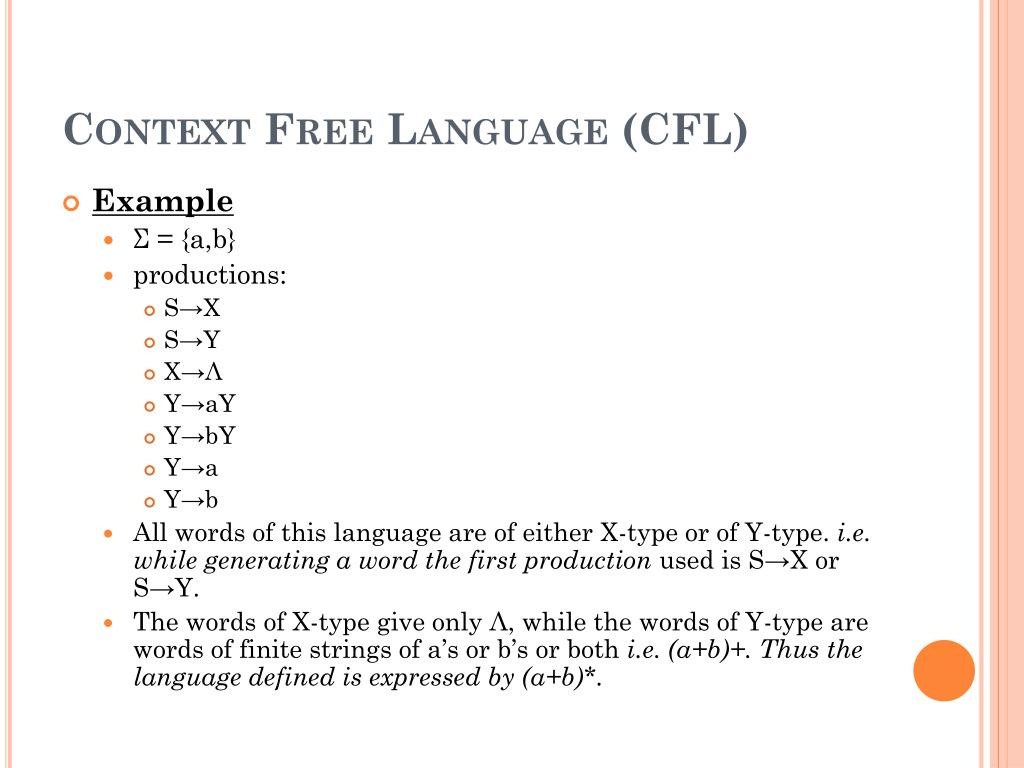 Context Free Language (CFL) • Example • Σ = {a,b} • productions: • S→X • S→Y • X→Λ • Y→aY • Y→bY • Y→a • Y→b • All words of this language are of either X-type or of Y-type. i.e. while generating a word the first production used is S→X or S→Y. • The words of X-type give only Λ, while the words of Y-type are words of finite strings of a’s or b’s or both i.e. (a+b)+. Thus the language defined is expressed by (a+b)*.