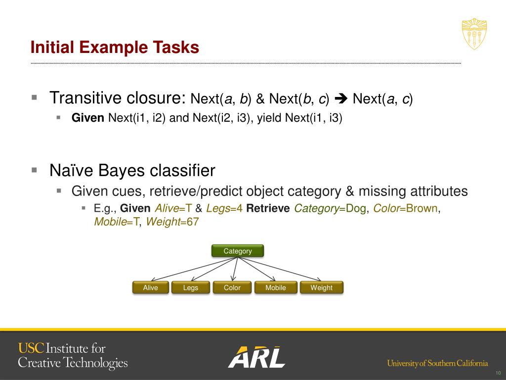 Initial Example Tasks • Transitive closure: Next(a, b) & Next(b, c) Next(a, c) • Given Next(i1, i2) and Next(i2, i3), yield Next(i1, i3) • Naïve Bayes classifier • Given cues, retrieve/predict object category & missing attributes • E.g., GivenAlive=T & Legs=4RetrieveCategory=Dog, Color=Brown, Mobile=T, Weight=67 Category Alive Legs Color Mobile Weight