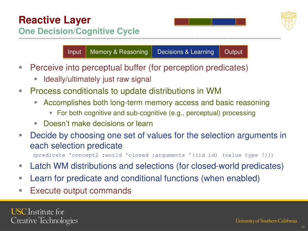Reactive LayerOne Decision/Cognitive Cycle Input Memory & Reasoning Decisions & Learning Output • Perceive into perceptual buffer (for perception predicates) • Ideally/ultimately just raw signal • Process conditionals to update distributions in WM • Accomplishes both long-term memory access and basic reasoning • For both cognitive and sub-cognitive (e.g., perceptual) processing • Doesn’t make decisions or learn • Decide by choosing one set of values for the selection arguments in each selection predicate (predicate 'concept2 :world 'closed :arguments '((id id) (value type !))) • Latch WM distributions and selections (for closed-world predicates) • Learn for predicate and conditional functions (when enabled) • Execute output commands