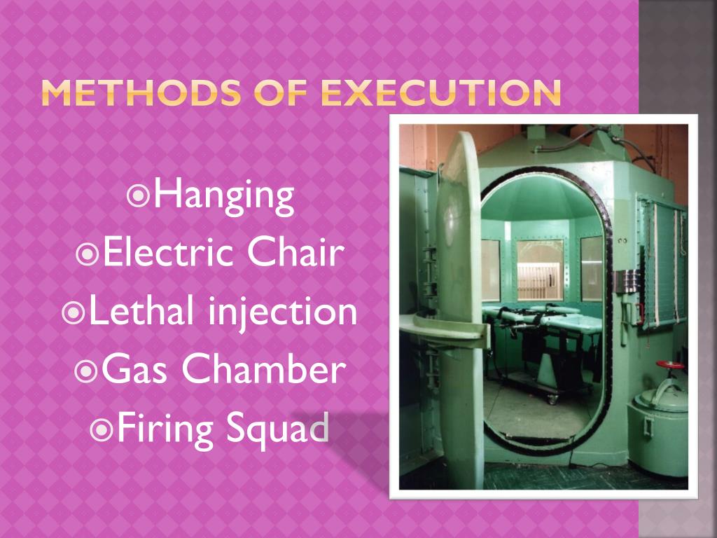 Methods of Execution • Hanging • Electric Chair • Lethal injection • Gas Chamber • Firing Squad