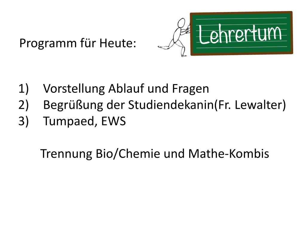 Programm für Heute: • Vorstellung Ablauf und Fragen • Begrüßung der Studiendekanin(Fr. Lewalter) • Tumpaed, EWS • Trennung Bio/Chemie und Mathe-Kombis