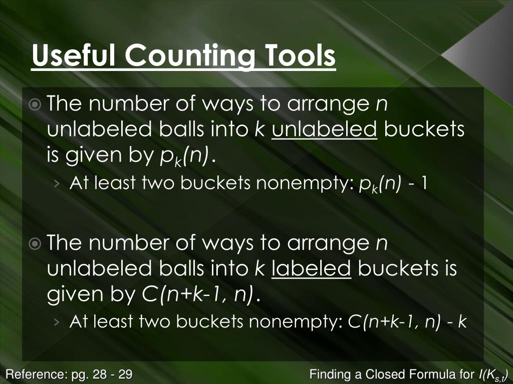 Useful Counting Tools The number of ways to arrange n unlabeled balls into kunlabeled buckets is given by pk(n). At least two buckets nonempty: pk(n) - 1 The number of ways to arrange n unlabeled balls into klabeled buckets is given by C(n+k-1, n). At least two buckets nonempty: C(n+k-1, n) - k Reference: pg. 28 - 29 Finding a Closed Formula for I(Ks,t)