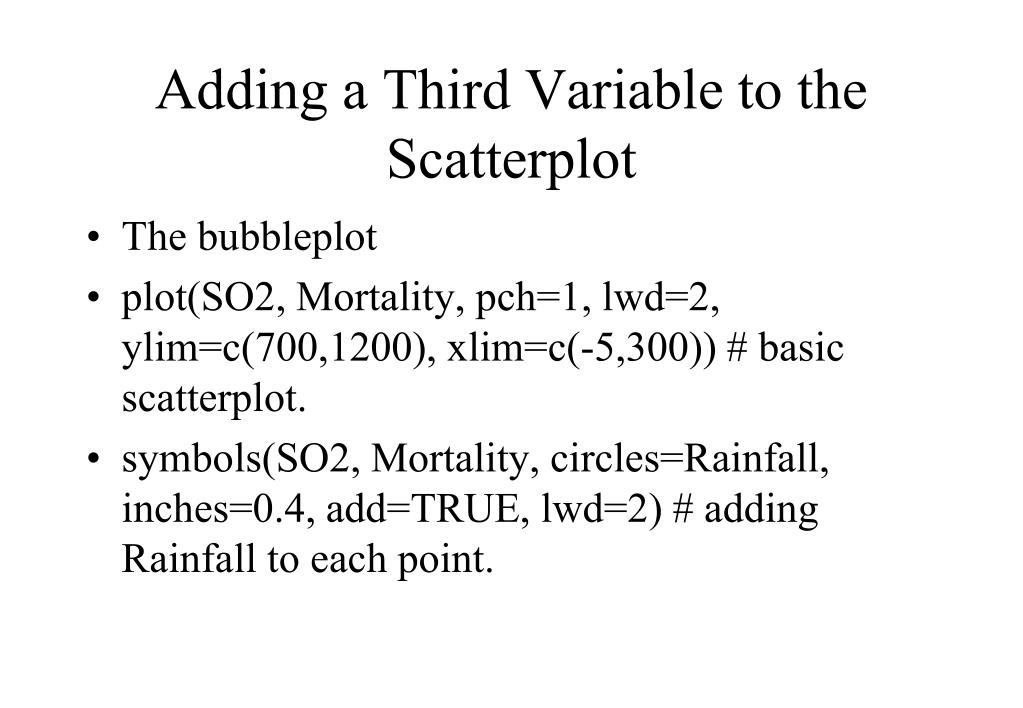 Adding a Third Variable to the Scatterplot • Thebubbleplot • plot(SO2, Mortality, pch=1, lwd=2, ylim=c(700,1200), xlim=c(-5,300)) # basic scatterplot. • symbols(SO2, Mortality, circles=Rainfall, inches=0.4, add=TRUE, lwd=2) # adding Rainfall to each point.
