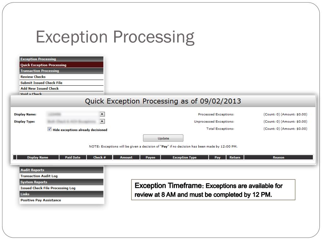 Review • Positive Pay is changing as of September 23rd, 2013. • All Issued File Templates will be mapped to the new service. • Exceptions must be resolved between 8 AM and 12 PM each day.