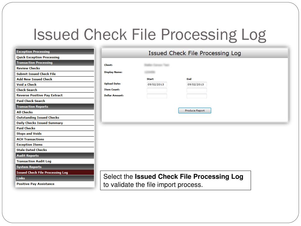 Issued Check File Processing Log Select the Issued Check File Processing Log to validate the file import process.