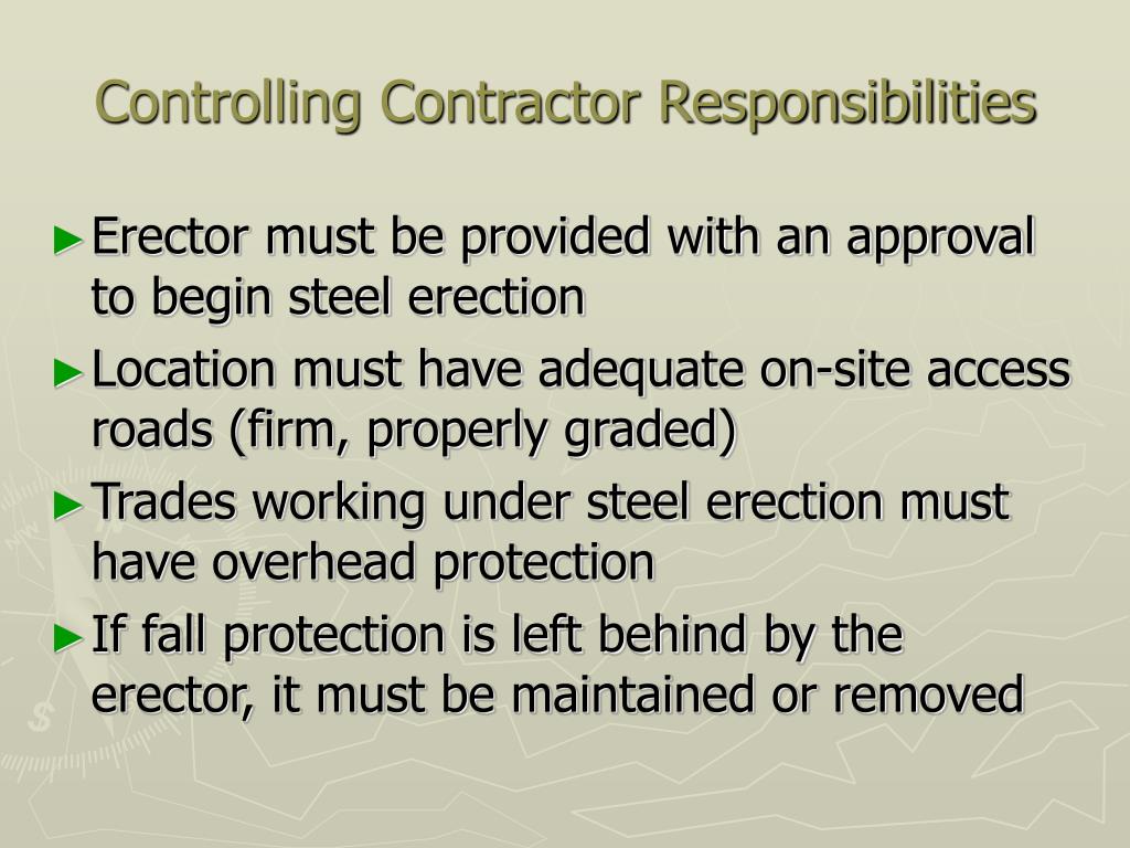 Controlling Contractor Responsibilities • Erector must be provided with an approval to begin steel erection • Location must have adequate on-site access roads (firm, properly graded) • Trades working under steel erection must have overhead protection • If fall protection is left behind by the erector, it must be maintained or removed