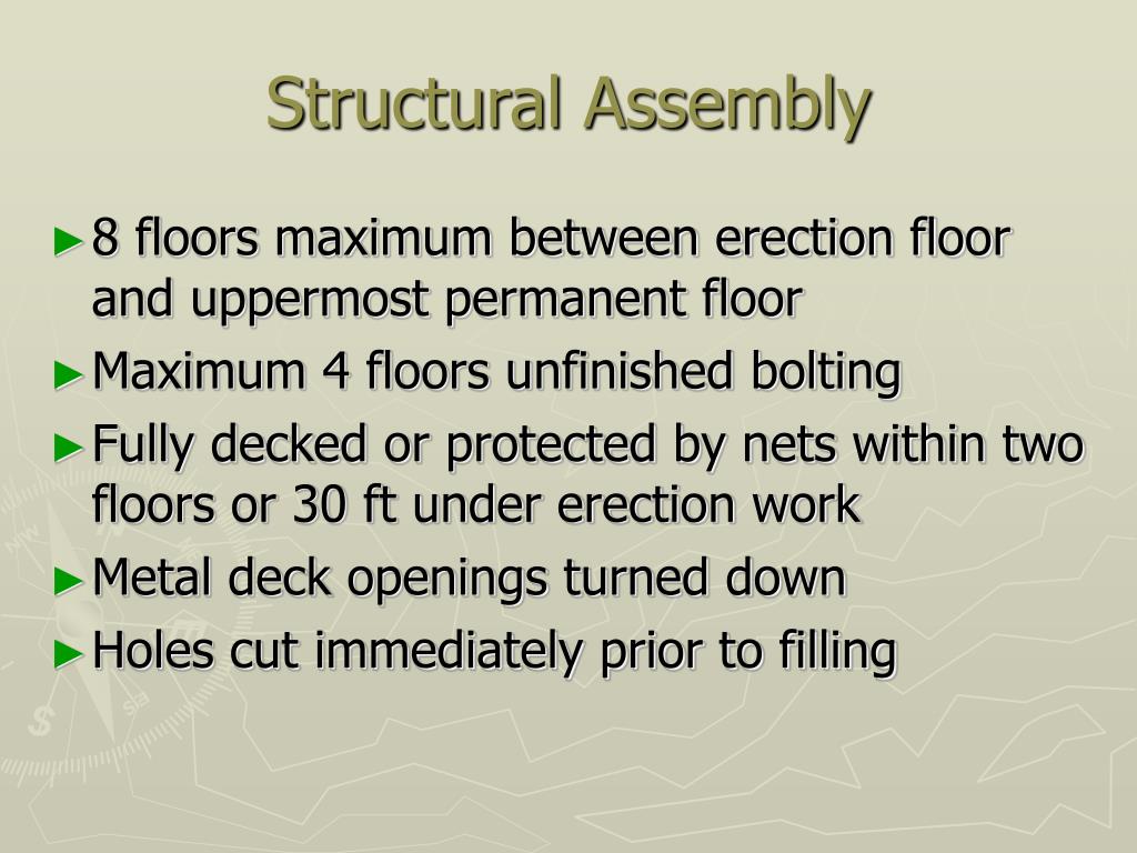 Structural Assembly • 8 floors maximum between erection floor and uppermost permanent floor • Maximum 4 floors unfinished bolting • Fully decked or protected by nets within two floors or 30 ft under erection work • Metal deck openings turned down • Holes cut immediately prior to filling