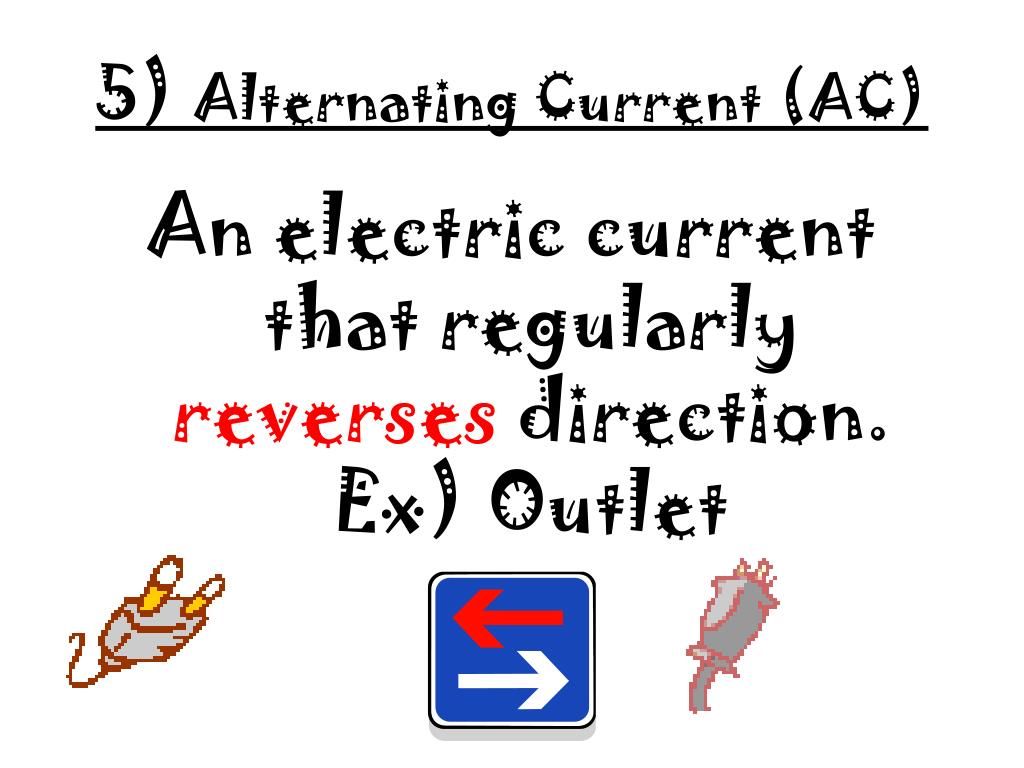 5) Alternating Current (AC) An electric current that regularly reverses direction.Ex) Outlet