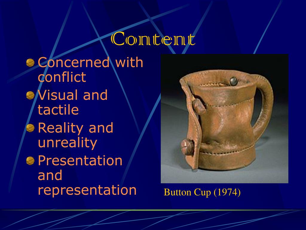Content • Concerned with conflict • Visual and tactile • Reality and unreality • Presentation and representation Button Cup (1974)