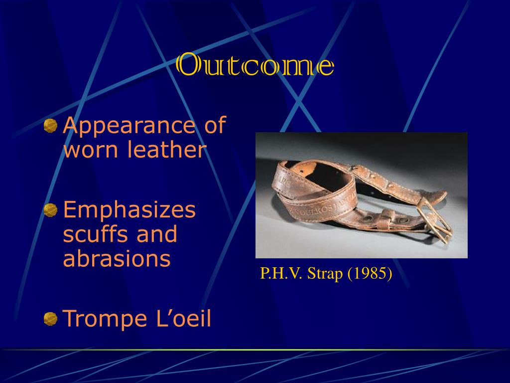 Outcome • Appearance of worn leather • Emphasizes scuffs and abrasions • Trompe L’oeil P.H.V. Strap (1985)