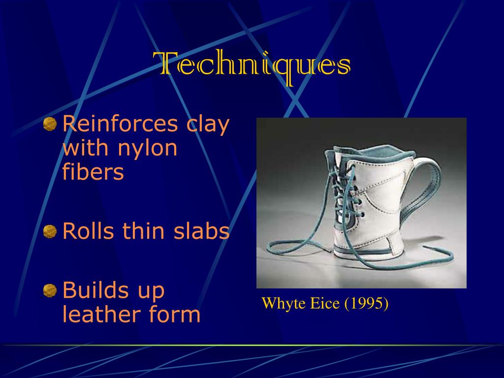 Techniques • Reinforces clay with nylon fibers • Rolls thin slabs • Builds up leather form Whyte Eice (1995)