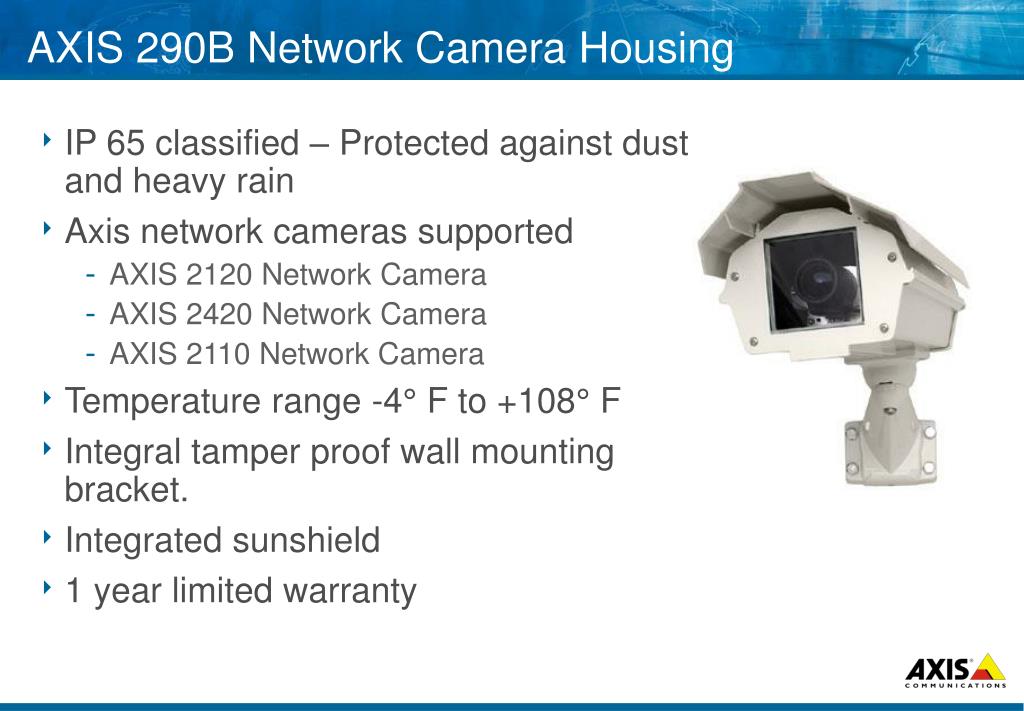 AXIS 290B Network Camera Housing • IP 65 classified – Protected against dust and heavy rain • Axis network cameras supported • AXIS 2120 Network Camera • AXIS 2420 Network Camera • AXIS 2110 Network Camera • Temperature range -4° F to +108° F • Integral tamper proof wall mounting bracket. • Integrated sunshield • 1 year limited warranty