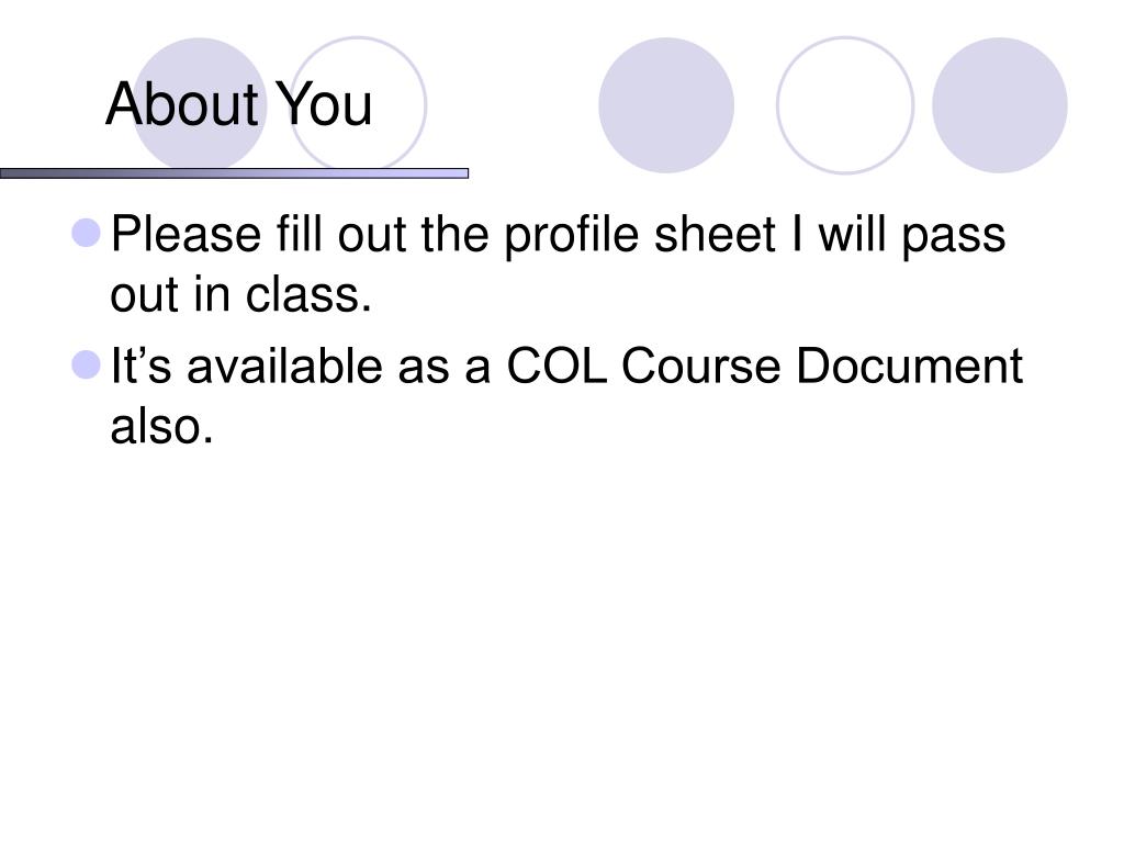 About You • Please fill out the profile sheet I will pass out in class. • It’s available as a COL Course Document also.