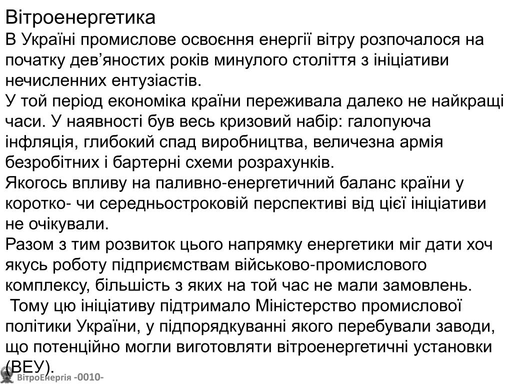 Вітроенергетика В Україні промислове освоєння енергії вітру розпочалося на початку дев’яностих років минулого століття з ініціативи нечисленних ентузіастів. У той період економіка країни переживала далеко не найкращі часи. У наявності був весь кризовий набір: галопуюча інфляція, глибокий спад виробництва, величезна армія безробітних і бартерні схеми розрахунків. Якогось впливу на паливно-енергетичний баланс країни у коротко- чи середньостроковій перспективі від цієї ініціативи не очікували. Разом з тим розвиток цього напрямку енергетики міг дати хоч якусь роботу підприємствам військово-промислового комплексу, більшість з яких на той час не мали замовлень. Тому цю ініціативу підтримало Міністерство промислової політики України, у підпорядкуванні якого перебували заводи, що потенційно могли виготовляти вітроенергетичні установки (ВЕУ). ВітроЕнергія -0010-