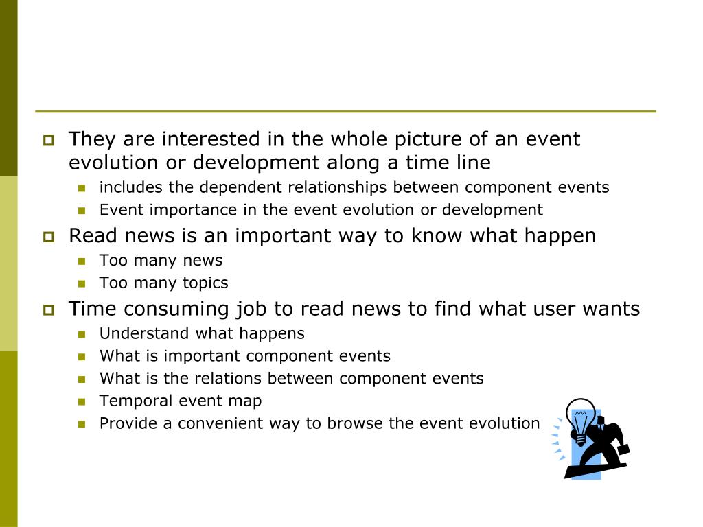 They are interested in the whole picture of an event evolution or development along a time line • includes the dependent relationships between component events • Event importance in the event evolution or development • Read news is an important way to know what happen • Too many news • Too many topics • Time consuming job to read news to find what user wants • Understand what happens • What is important component events • What is the relations between component events • Temporal event map • Provide a convenient way to browse the event evolution