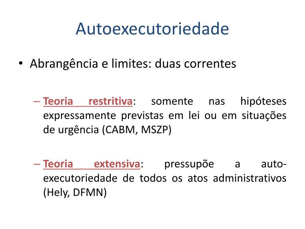 Autoexecutoriedade • Abrangência e limites: duas correntes • Teoria restritiva: somente nas hipóteses expressamente previstas em lei ou em situações de urgência (CABM, MSZP) • Teoria extensiva: pressupõe a auto-executoriedade de todos os atos administrativos (Hely, DFMN)