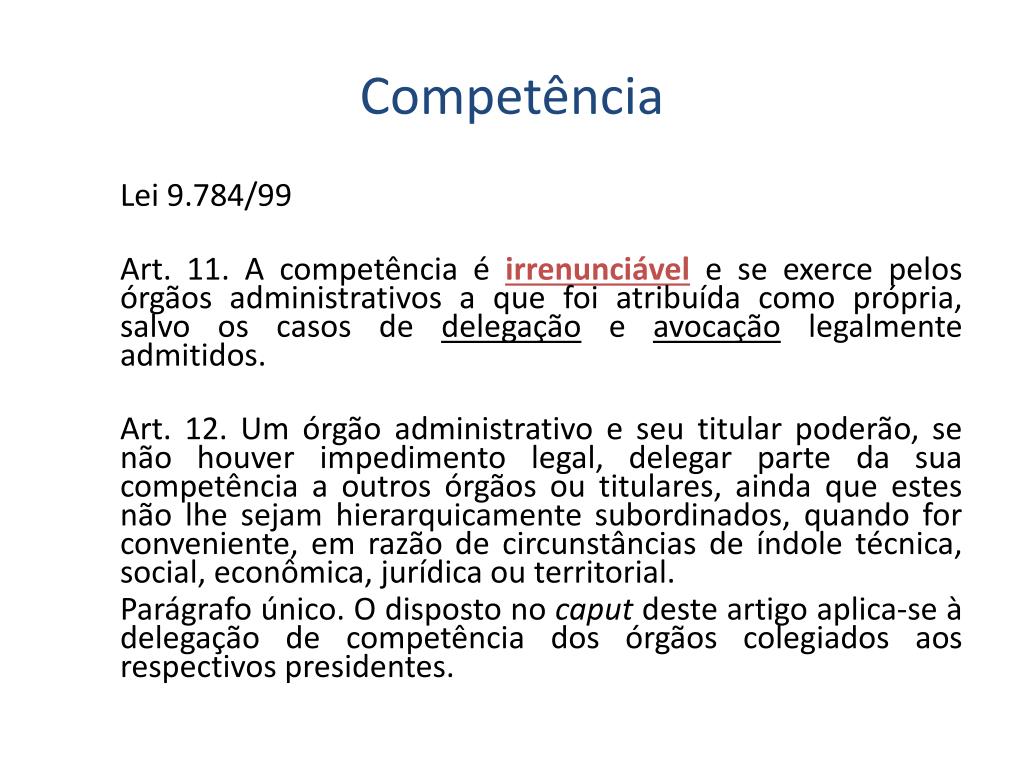 Competência Lei 9.784/99 Art. 11. A competência é irrenunciável e se exerce pelos órgãos administrativos a que foi atribuída como própria, salvo os casos de delegação e avocação legalmente admitidos. Art. 12. Um órgão administrativo e seu titular poderão, se não houver impedimento legal, delegar parte da sua competência a outros órgãos ou titulares, ainda que estes não lhe sejam hierarquicamente subordinados, quando for conveniente, em razão de circunstâncias de índole técnica, social, econômica, jurídica ou territorial. Parágrafo único. O disposto no caput deste artigo aplica-se à delegação de competência dos órgãos colegiados aos respectivos presidentes.