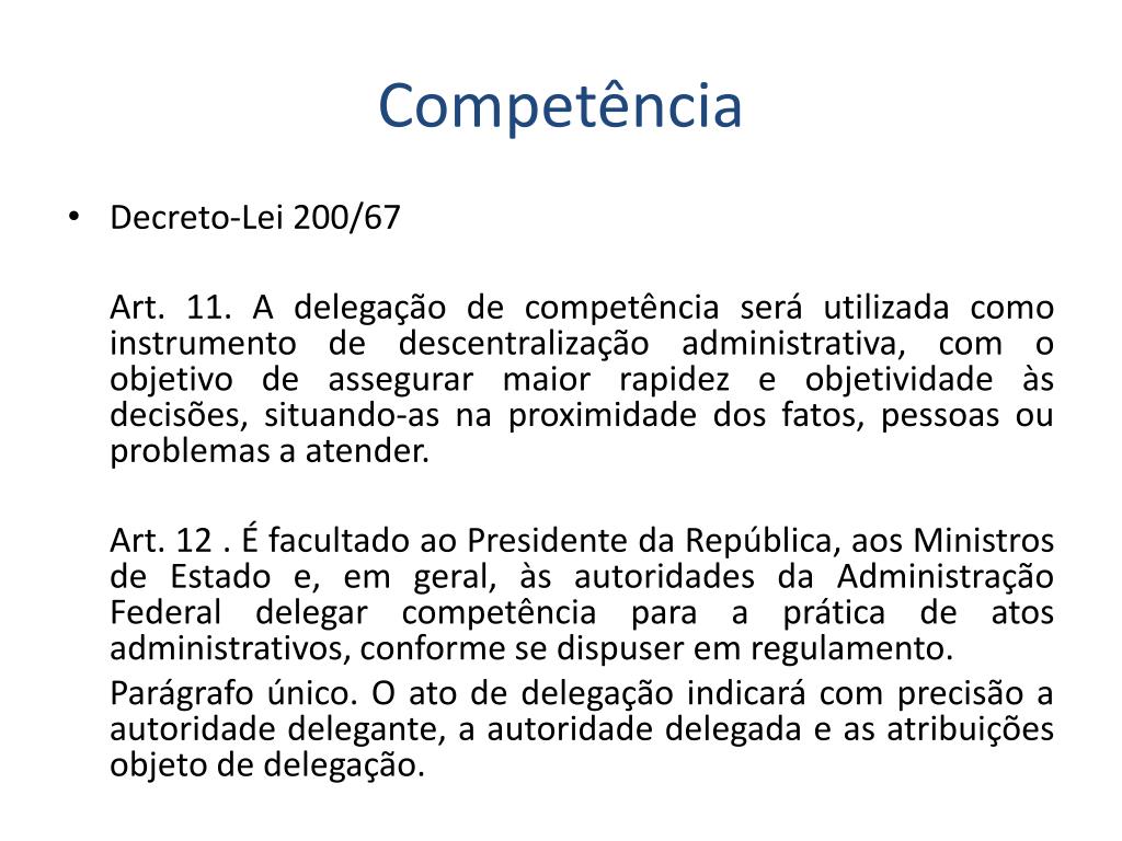 Competência • Decreto-Lei 200/67 Art. 11. A delegação de competência será utilizada como instrumento de descentralização administrativa, com o objetivo de assegurar maior rapidez e objetividade às decisões, situando-as na proximidade dos fatos, pessoas ou problemas a atender. Art. 12 . É facultado ao Presidente da República, aos Ministros de Estado e, em geral, às autoridades da Administração Federal delegar competência para a prática de atos administrativos, conforme se dispuser em regulamento. Parágrafo único. O ato de delegação indicará com precisão a autoridade delegante, a autoridade delegada e as atribuições objeto de delegação.