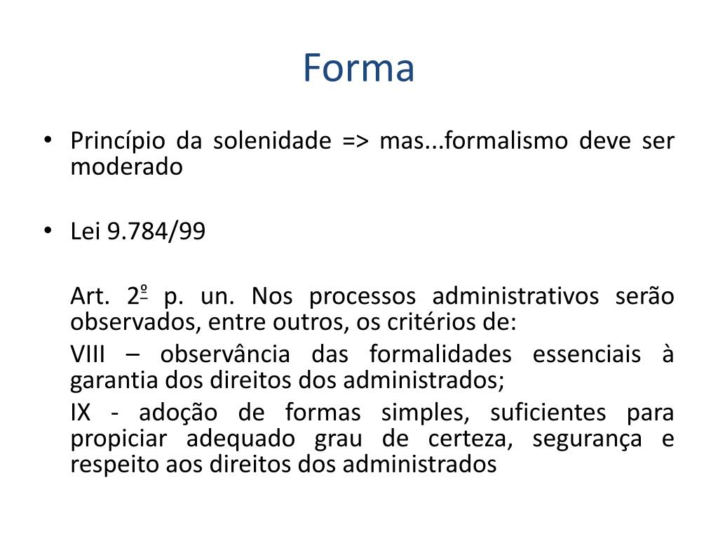 Forma • Princípio da solenidade => mas...formalismo deve ser moderado • Lei 9.784/99 Art. 2º p. un. Nos processos administrativos serão observados, entre outros, os critérios de: VIII – observância das formalidades essenciais à garantia dos direitos dos administrados; IX - adoção de formas simples, suficientes para propiciar adequado grau de certeza, segurança e respeito aos direitos dos administrados