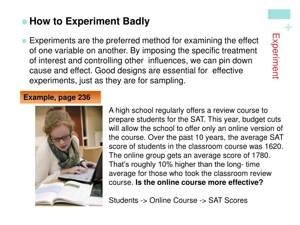 Experiment • How to Experiment Badly • Experiments are the preferred method for examining the effect of one variable on another. By imposing the specific treatment of interest and controlling other influences, we can pin down cause and effect. Good designs are essential for effective experiments, just as they are for sampling. Example, page 236 A high school regularly offers a review course to prepare students for the SAT. This year, budget cuts will allow the school to offer only an online version of the course. Over the past 10 years, the average SAT score of students in the classroom course was 1620. The online group gets an average score of 1780. That’s roughly 10% higher than the long- time average for those who took the classroom review course. Is the online course more effective? Students -> Online Course -> SAT Scores