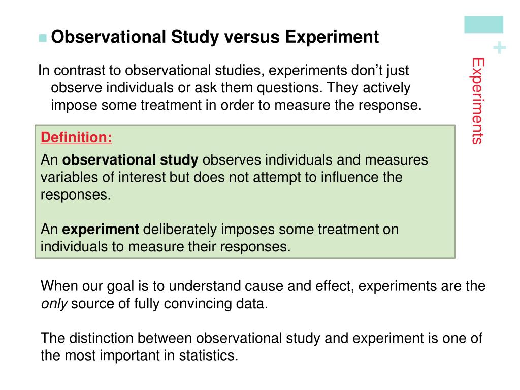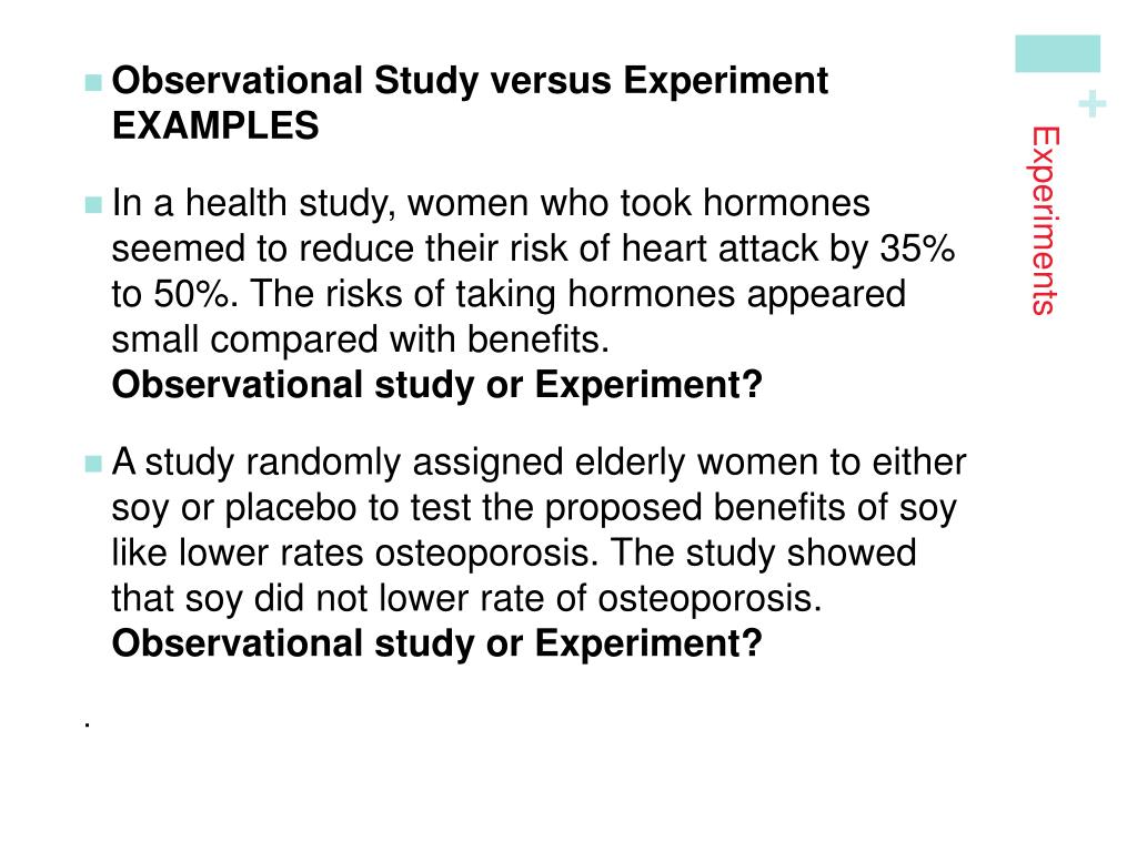 Experiments • Observational Study versus Experiment EXAMPLES • In a health study, women who took hormones seemed to reduce their risk of heart attack by 35% to 50%. The risks of taking hormones appeared small compared with benefits. Observational study or Experiment? • A study randomly assigned elderly women to either soy or placebo to test the proposed benefits of soy like lower rates osteoporosis. The study showed that soy did not lower rate of osteoporosis. Observational study or Experiment? .