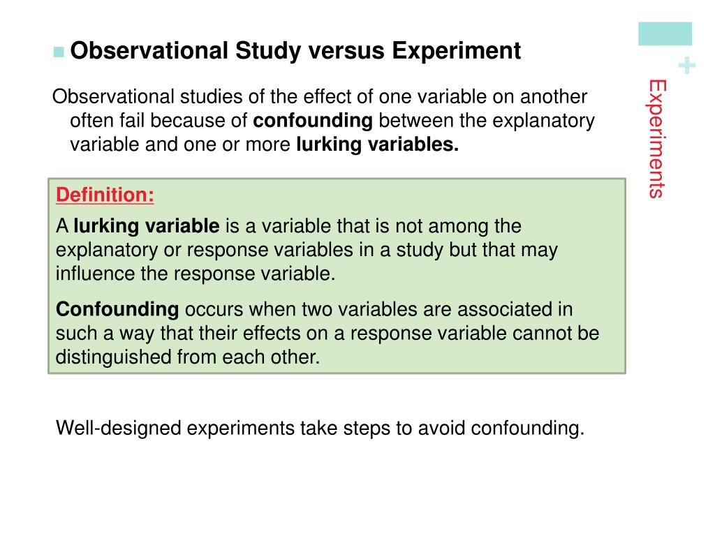 Experiments • Observational Study versus Experiment Observational studies of the effect of one variable on another often fail because of confounding between the explanatory variable and one or more lurking variables. Definition: A lurking variable is a variable that is not among the explanatory or response variables in a study but that may influence the response variable. Confounding occurs when two variables are associated in such a way that their effects on a response variable cannot be distinguished from each other. Well-designed experiments take steps to avoid confounding.