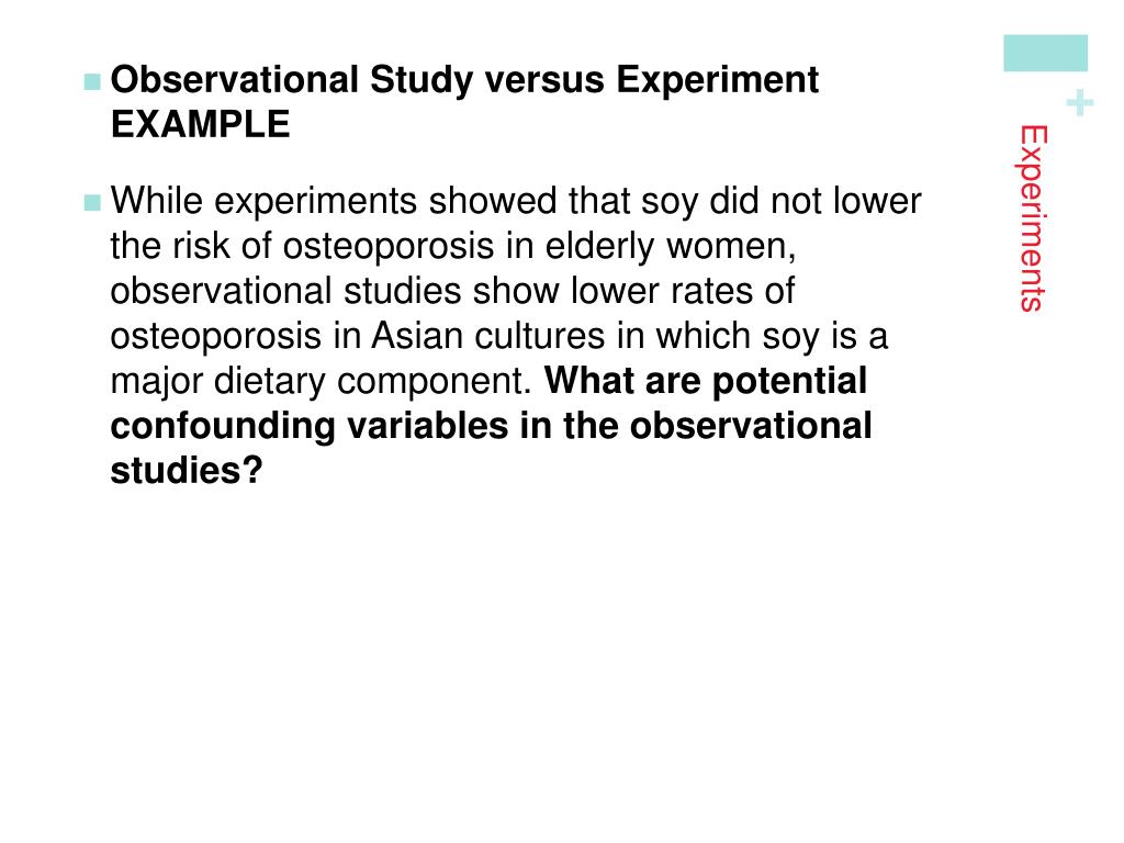 Experiments • Observational Study versus Experiment EXAMPLE • While experiments showed that soy did not lower the risk of osteoporosis in elderly women, observational studies show lower rates of osteoporosis in Asian cultures in which soy is a major dietary component. What are potential confounding variables in the observational studies?