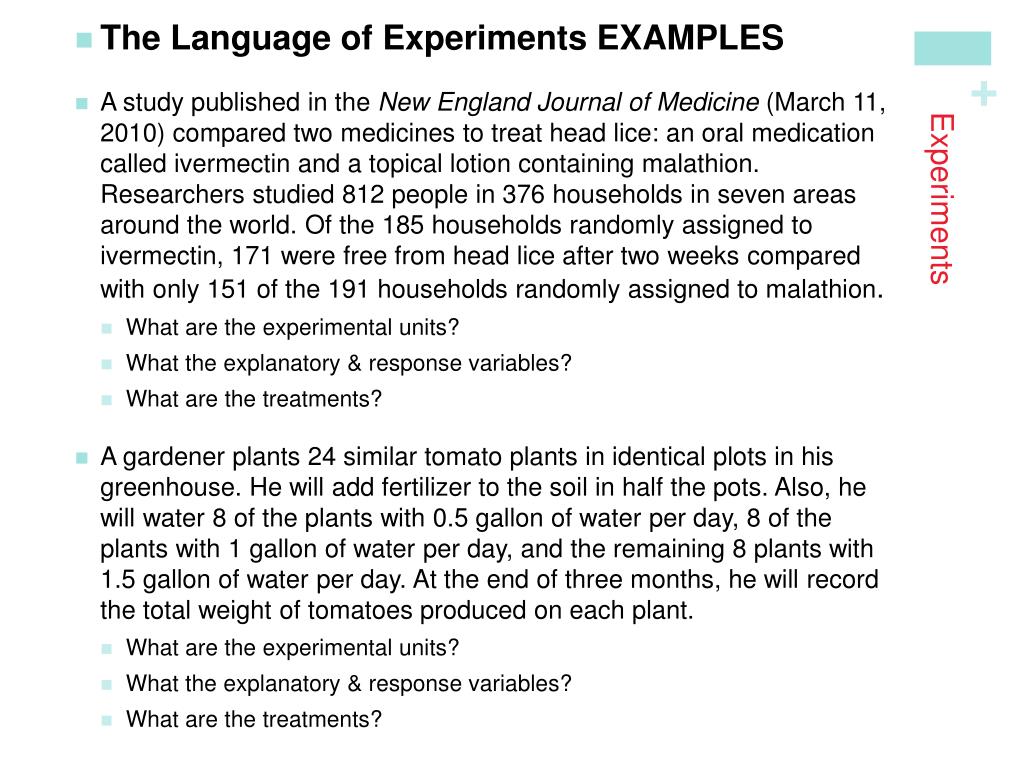 Experiments • The Language of Experiments EXAMPLES • A study published in the New England Journal of Medicine (March 11, 2010) compared two medicines to treat head lice: an oral medication called ivermectin and a topical lotion containing malathion. Researchers studied 812 people in 376 households in seven areas around the world. Of the 185 households randomly assigned to ivermectin, 171 were free from head lice after two weeks compared with only 151 of the 191 households randomly assigned to malathion. • What are the experimental units? • What the explanatory & response variables? • What are the treatments? • A gardener plants 24 similar tomato plants in identical plots in his greenhouse. He will add fertilizer to the soil in half the pots. Also, he will water 8 of the plants with 0.5 gallon of water per day, 8 of the plants with 1 gallon of water per day, and the remaining 8 plants with 1.5 gallon of water per day. At the end of three months, he will record the total weight of tomatoes produced on each plant. • What are the experimental units? • What the explanatory & response variables? • What are the treatments?