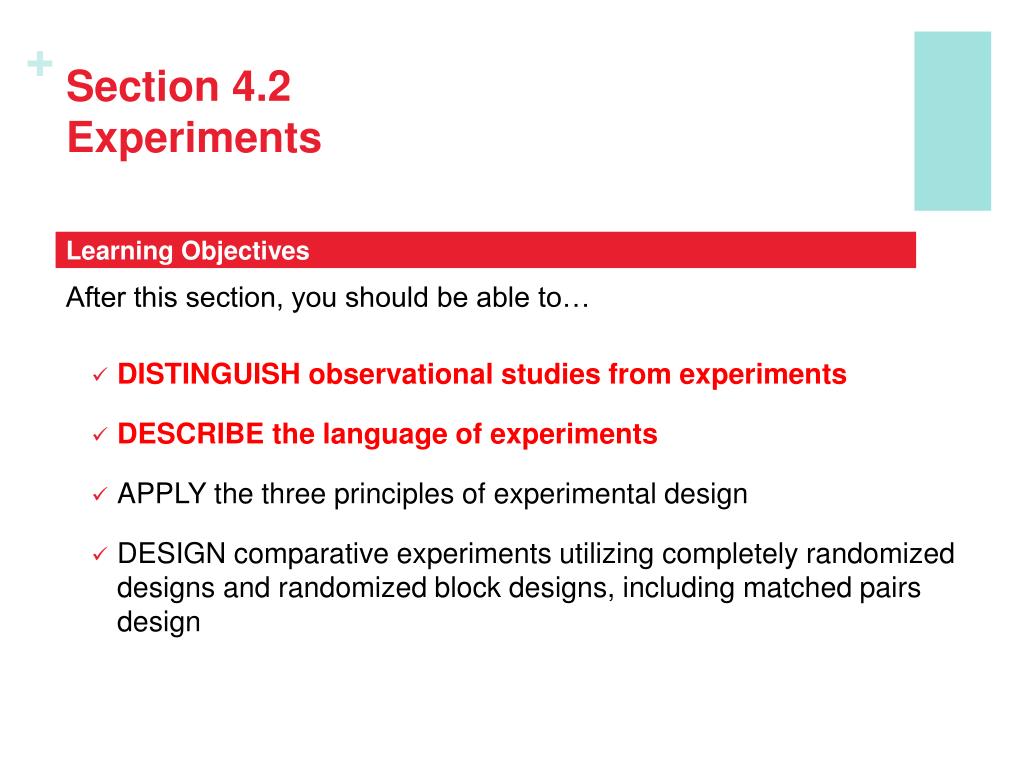Chapter 4 Designing Studies. 4.1 Samples and Surveys 4.2 Experiments 4.3 Using Studies Wisely. Section 4.2 Experiments. Learning Objectives. After this section, you should be able to… DISTINGUISH observational studies from experiments DESCRIBE the language of experiments