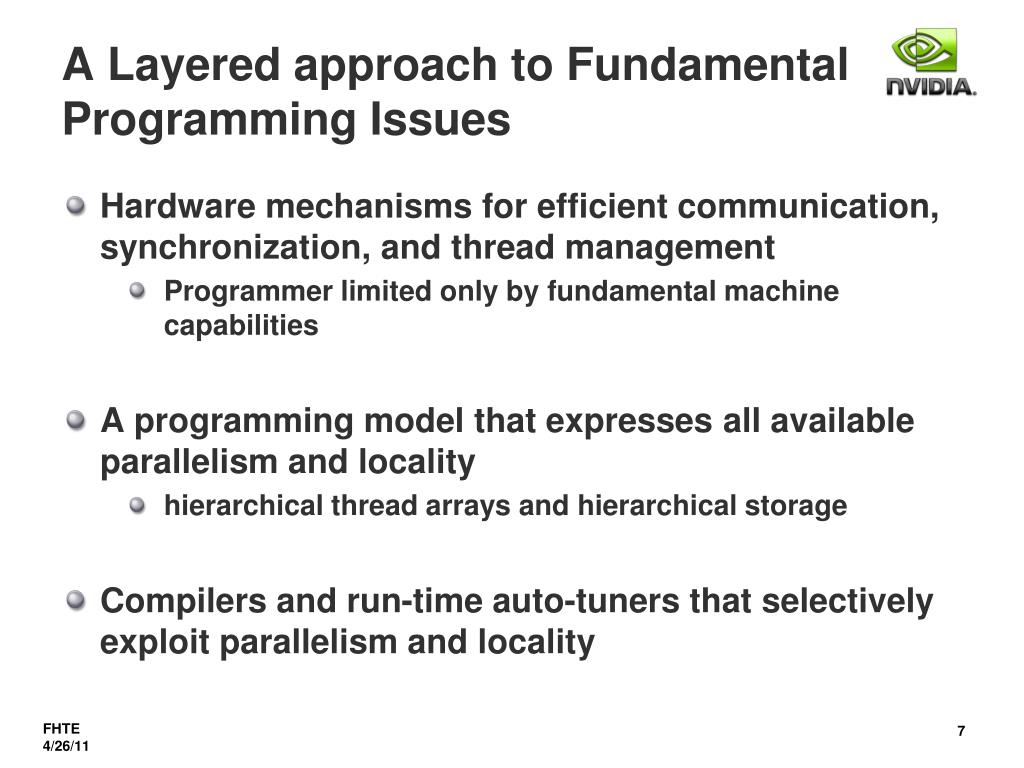 A Layered approach to Fundamental Programming Issues • Hardware mechanisms for efficient communication, synchronization, and thread management • Programmer limited only by fundamental machine capabilities • A programming model that expresses all available parallelism and locality • hierarchical thread arrays and hierarchical storage • Compilers and run-time auto-tuners that selectively exploit parallelism and locality