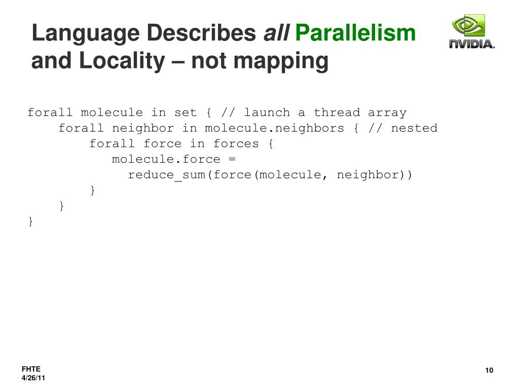 Language Describes all Parallelism and Locality – not mapping forall molecule in set { // launch a thread array forall neighbor in molecule.neighbors { // nested forall force in forces { molecule.force = reduce_sum(force(molecule, neighbor)) } } }