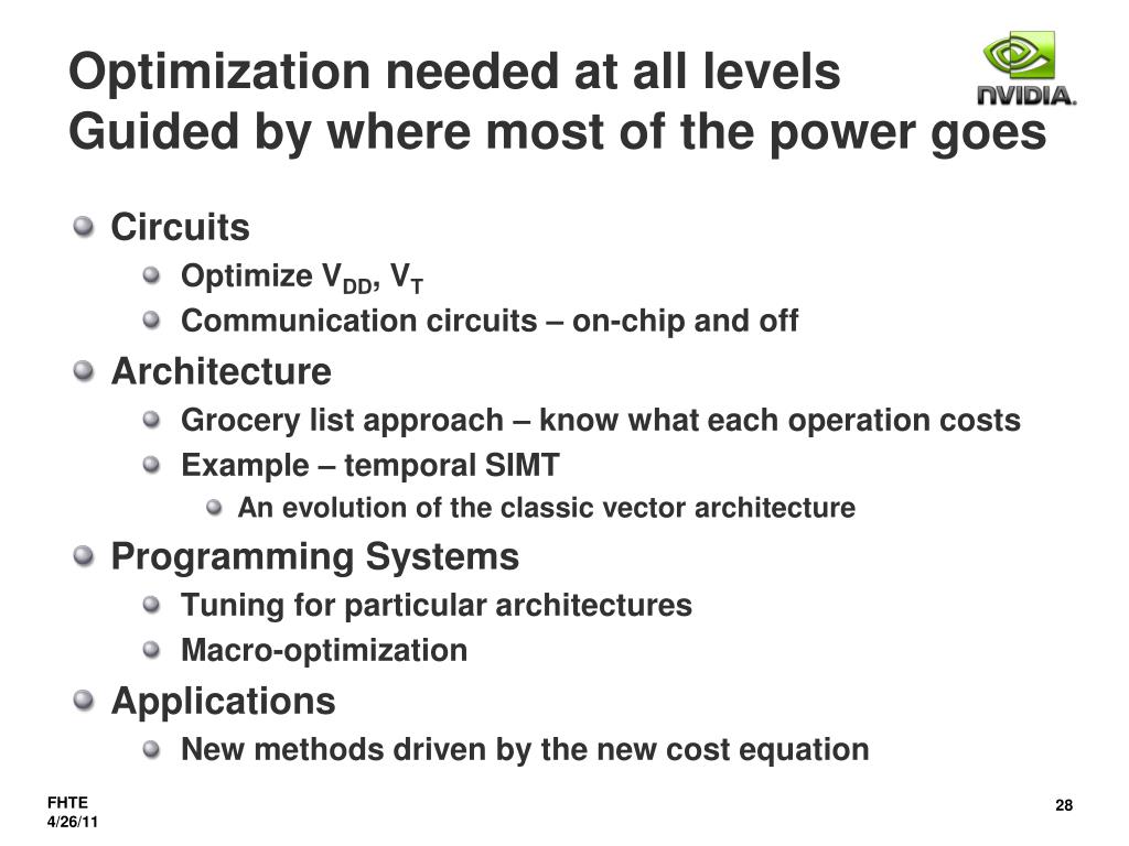 Optimization needed at all levelsGuided by where most of the power goes • Circuits • Optimize VDD, VT • Communication circuits – on-chip and off • Architecture • Grocery list approach – know what each operation costs • Example – temporal SIMT • An evolution of the classic vector architecture • Programming Systems • Tuning for particular architectures • Macro-optimization • Applications • New methods driven by the new cost equation
