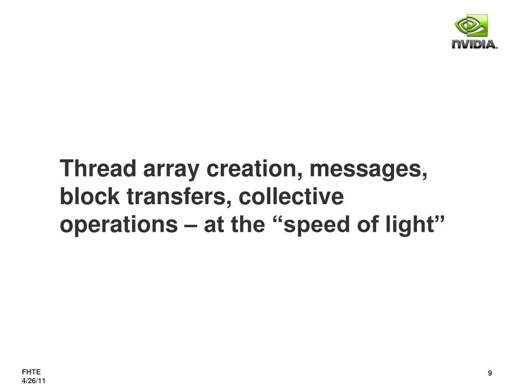 Thread array creation, messages, block transfers, collective operations – at the “speed of light”