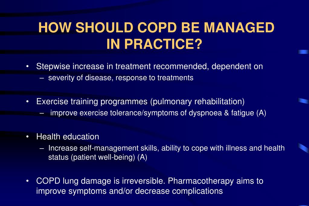 HOW SHOULD COPD BE MANAGED IN PRACTICE? • Stepwise increase in treatment recommended, dependent on • severity of disease, response to treatments • Exercise training programmes (pulmonary rehabilitation) • improve exercise tolerance/symptoms of dyspnoea & fatigue (A) • Health education • Increase self-management skills, ability to cope with illness and health status (patient well-being) (A) • COPD lung damage is irreversible. Pharmacotherapy aims to improve symptoms and/or decrease complications