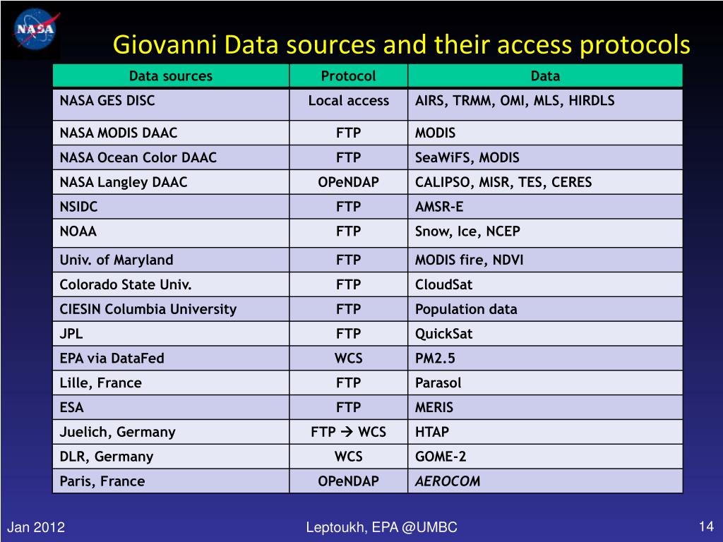Giovanni Data sources and their access protocols Leptoukh, EPA @UMBC