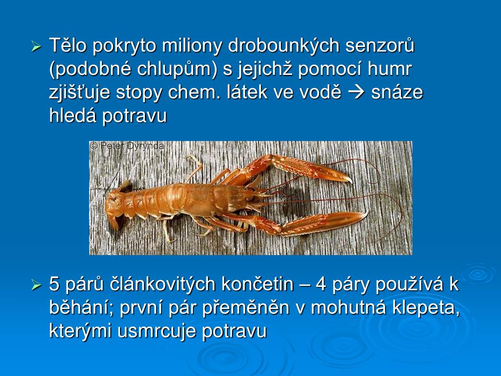Tělo pokryto miliony drobounkých senzorů (podobné chlupům) s jejichž pomocí humr zjišťuje stopy chem. látek ve vodě snáze hledá potravu • 5 párů článkovitých končetin – 4 páry používá k běhání; první pár přeměněn v mohutná klepeta, kterými usmrcuje potravu