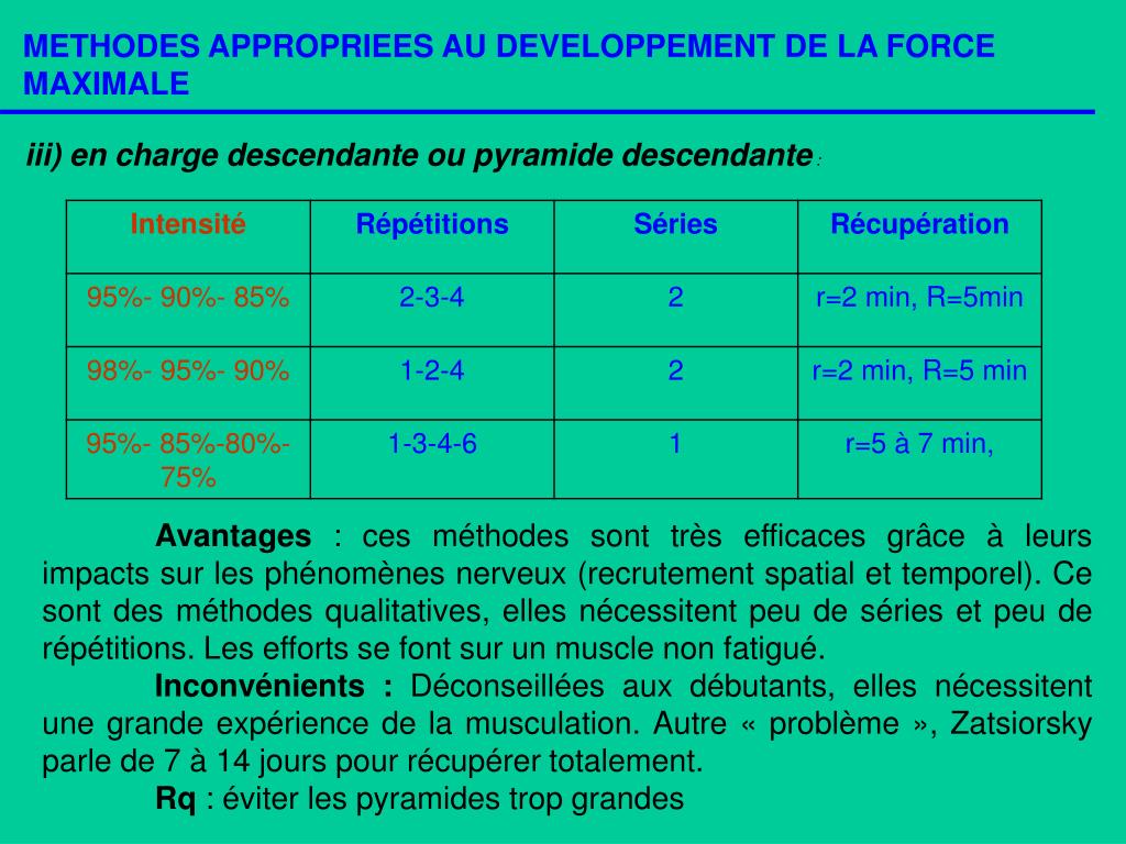 METHODES APPROPRIEES AU DEVELOPPEMENT DE LA FORCE MAXIMALE iii) en charge descendante ou pyramide descendante : Avantages : ces méthodes sont très efficaces grâce à leurs impacts sur les phénomènes nerveux (recrutement spatial et temporel). Ce sont des méthodes qualitatives, elles nécessitent peu de séries et peu de répétitions. Les efforts se font sur un muscle non fatigué. Inconvénients : Déconseillées aux débutants, elles nécessitent une grande expérience de la musculation. Autre « problème », Zatsiorsky parle de 7 à 14 jours pour récupérer totalement. Rq : éviter les pyramides trop grandes