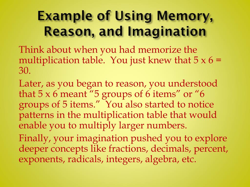 Example of Using Memory, Reason, and Imagination Think about when you had memorize the multiplication table. You just knew that 5 x 6 = 30. Later, as you began to reason, you understood that 5 x 6 meant “5 groups of 6 items” or “6 groups of 5 items.” You also started to notice patterns in the multiplication table that would enable you to multiply larger numbers. Finally, your imagination pushed you to explore deeper concepts like fractions, decimals, percent, exponents, radicals, integers, algebra, etc.