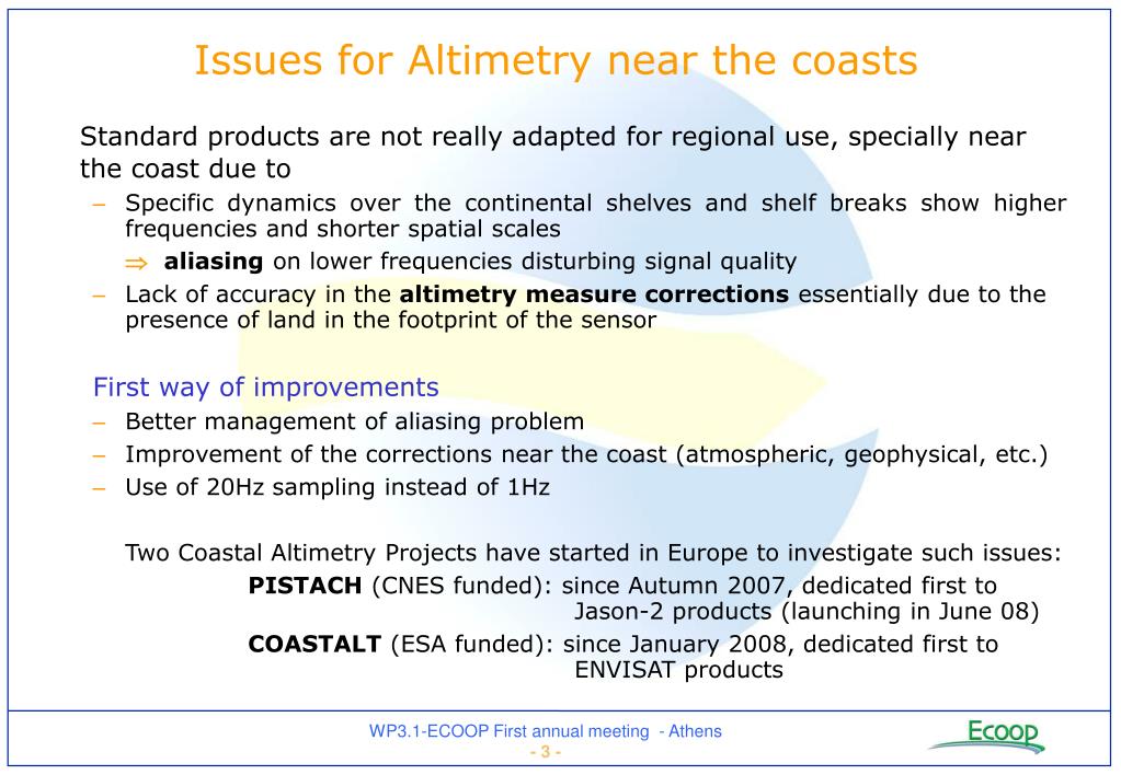Issues for Altimetry near the coasts Standard products are not really adapted for regional use, specially near the coast due to • Specific dynamics over the continental shelves and shelf breaks show higher frequencies and shorter spatial scales aliasing on lower frequencies disturbing signal quality • Lack of accuracy in the altimetry measure corrections essentially due to the presence of land in the footprint of the sensor First way of improvements • Better management of aliasing problem • Improvement of the corrections near the coast (atmospheric, geophysical, etc.) • Use of 20Hz sampling instead of 1Hz Two Coastal Altimetry Projects have started in Europe to investigate such issues: PISTACH (CNES funded): since Autumn 2007, dedicated first to Jason-2 products (launching in June 08) COASTALT (ESA funded): since January 2008, dedicated first to ENVISAT products