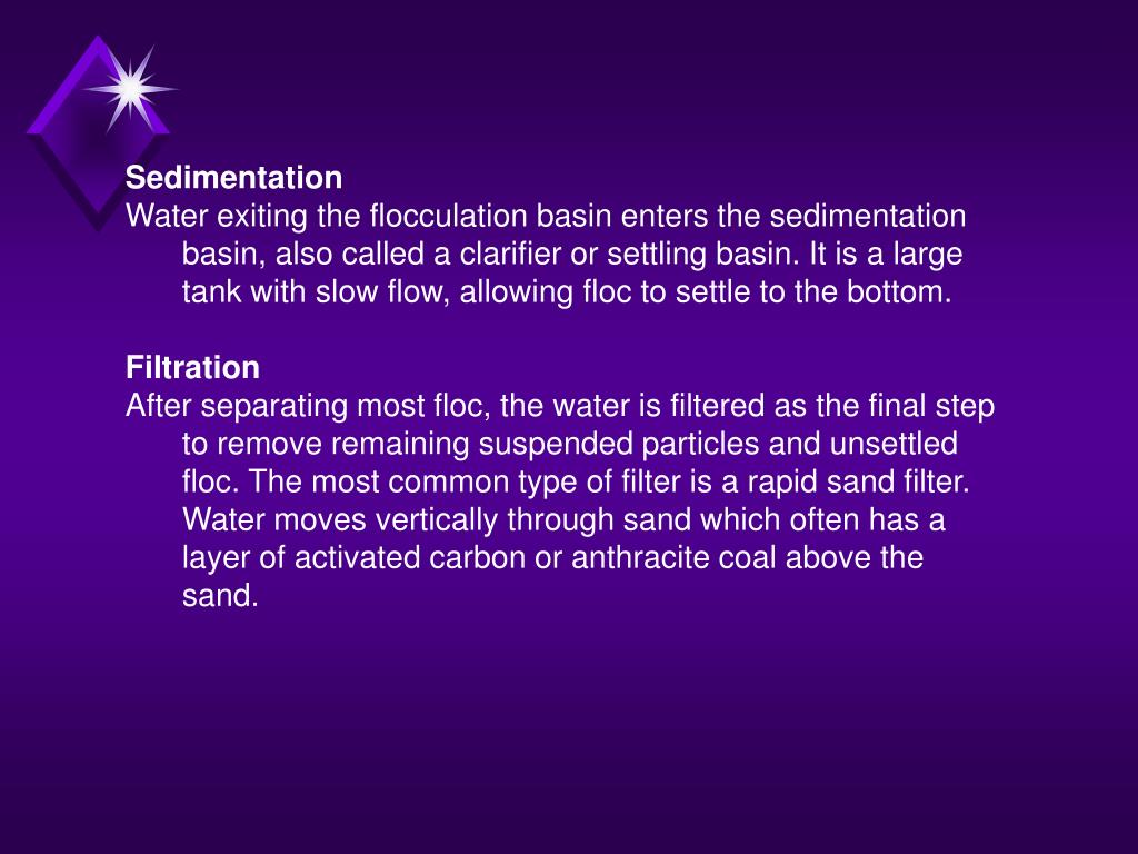 Sedimentation Water exiting the flocculation basin enters the sedimentation basin, also called a clarifier or settling basin. It is a large tank with slow flow, allowing floc to settle to the bottom. Filtration After separating most floc, the water is filtered as the final step to remove remaining suspended particles and unsettled floc. The most common type of filter is a rapid sand filter. Water moves vertically through sand which often has a layer of activated carbon or anthracite coal above the sand.
