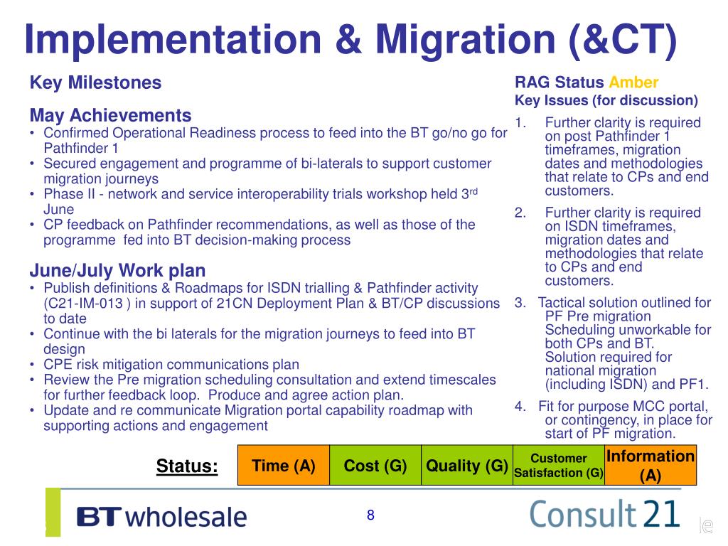 RAG Status Amber Key Issues (for discussion) Further clarity is required on post Pathfinder 1 timeframes, migration dates and methodologies that relate to CPs and end customers. Further clarity is required on ISDN timeframes, migration dates and methodologies that relate to CPs and end customers. 3. Tactical solution outlined for PF Pre migration Scheduling unworkable for both CPs and BT. Solution required for national migration (including ISDN) and PF1. 4. Fit for purpose MCC portal, or contingency, in place for start of PF migration. Implementation & Migration (&CT) • Key Milestones • May Achievements • Confirmed Operational Readiness process to feed into the BT go/no go for Pathfinder 1 • Secured engagement and programme of bi-laterals to support customer migration journeys • Phase II - network and service interoperability trials workshop held 3rd June • CP feedback on Pathfinder recommendations, as well as those of the programme fed into BT decision-making process • June/July Work plan • Publish definitions & Roadmaps for ISDN trialling & Pathfinder activity (C21-IM-013 ) in support of 21CN Deployment Plan & BT/CP discussions to date • Continue with the bi laterals for the migration journeys to feed into BT design • CPE risk mitigation communications plan • Review the Pre migration scheduling consultation and extend timescales for further feedback loop. Produce and agree action plan. • Update and re communicate Migration portal capability roadmap with supporting actions and engagement Time (A) Cost (G) Quality (G) Customer Satisfaction (G) Information (A) Status: