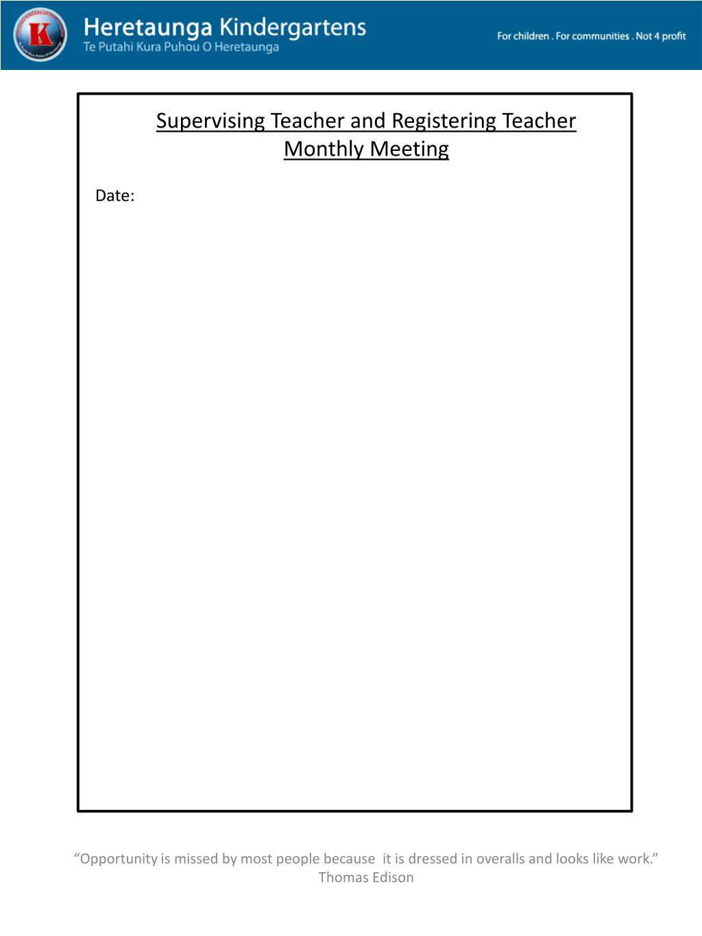 Registering Teacher – Supervising Teacher Contract. • Support. • Supervising Teacher will support and guide the registering teacher in all areas of the Registration Programme. • Meetings every month will be established between the Supervising Teacher and Registering Teacher for ongoing assessment and appraisal. • Supervising Teacher will encourage registering teacher to participate in all areas of the Kindergarten Curriculum and share appropriate information. • Release time will be made available for the supervising teacher to observe the registering teacher once a term. • Meetings. • Registering teacher will attend a twice yearly meetings with Education Manager. Appointments times for these meetings will be initiated by the teacher • Supervising Teacher of registering teacher will attend meetings if requested by Education Manager. “Opportunity is missed by most people because it is dressed in overalls and looks like work.” Thomas Edison