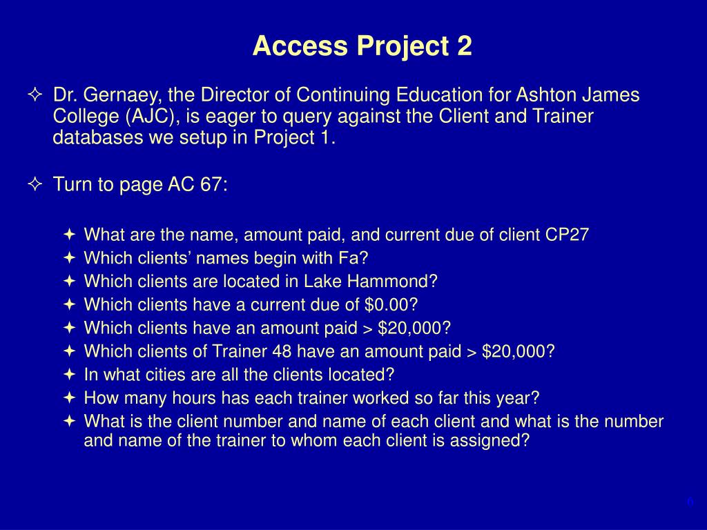 Access Project 2 • Dr. Gernaey, the Director of Continuing Education for Ashton James College (AJC), is eager to query against the Client and Trainer databases we setup in Project 1. • Turn to page AC 67: • What are the name, amount paid, and current due of client CP27 • Which clients’ names begin with Fa? • Which clients are located in Lake Hammond? • Which clients have a current due of $0.00? • Which clients have an amount paid > $20,000? • Which clients of Trainer 48 have an amount paid > $20,000? • In what cities are all the clients located? • How many hours has each trainer worked so far this year? • What is the client number and name of each client and what is the number and name of the trainer to whom each client is assigned?