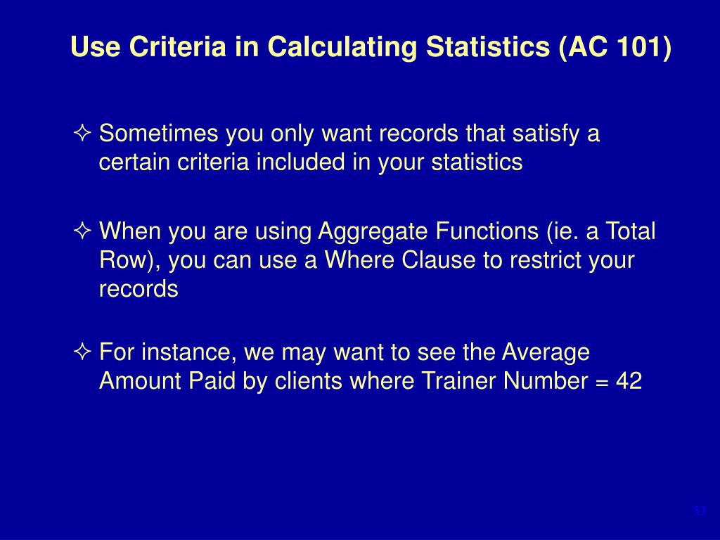Use Criteria in Calculating Statistics (AC 101) • Sometimes you only want records that satisfy a certain criteria included in your statistics • When you are using Aggregate Functions (ie. a Total Row), you can use a Where Clause to restrict your records • For instance, we may want to see the Average Amount Paid by clients where Trainer Number = 42