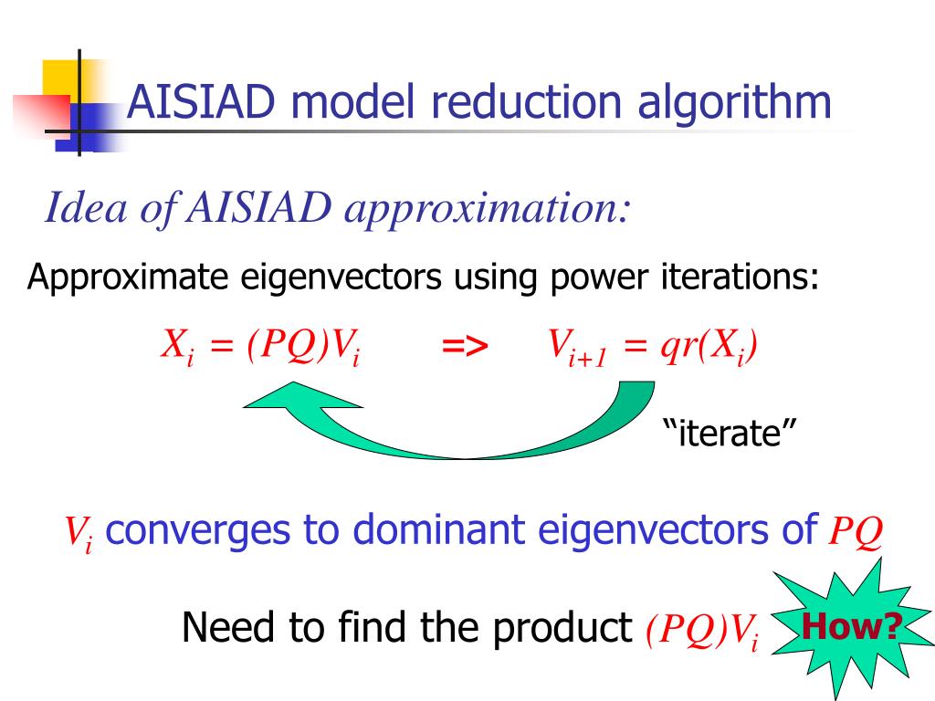 Xi= (PQ)Vi => Vi+1= qr(Xi) “iterate” AISIAD model reduction algorithm Idea of AISIAD approximation: Approximate eigenvectors using power iterations: Viconverges to dominant eigenvectors ofPQ Need to find the product (PQ)Vi How?