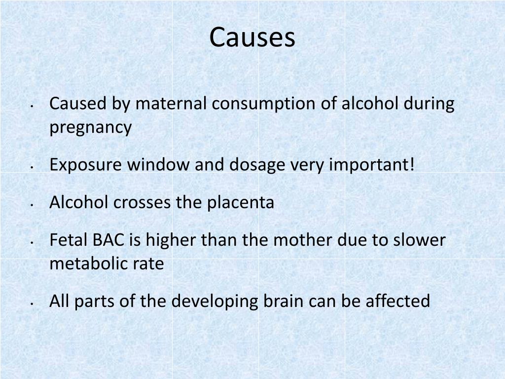 Causes • Caused by maternal consumption of alcohol during pregnancy • Exposure window and dosage very important! • Alcohol crosses the placenta • Fetal BAC is higher than the mother due to slower metabolic rate • All parts of the developing brain can be affected