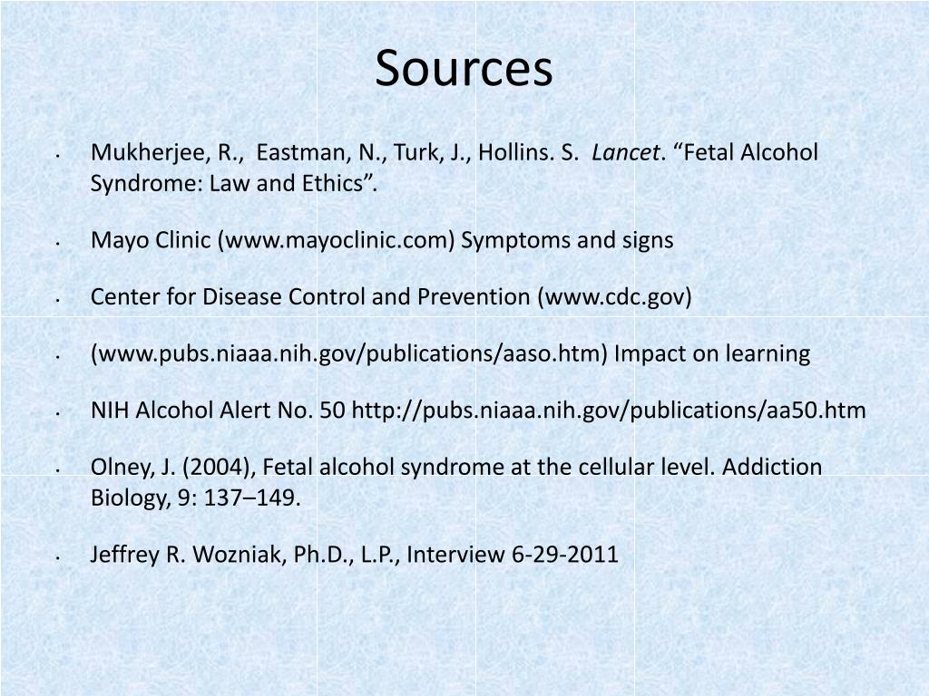 Sources • Mukherjee, R., Eastman, N., Turk, J., Hollins. S. Lancet. “Fetal Alcohol Syndrome: Law and Ethics”. • Mayo Clinic (www.mayoclinic.com) Symptoms and signs • Center for Disease Control and Prevention (www.cdc.gov) • (www.pubs.niaaa.nih.gov/publications/aaso.htm) Impact on learning • NIH Alcohol Alert No. 50 http://pubs.niaaa.nih.gov/publications/aa50.htm • Olney, J. (2004), Fetal alcohol syndrome at the cellular level. Addiction Biology, 9: 137–149. • Jeffrey R. Wozniak, Ph.D., L.P., Interview 6-29-2011