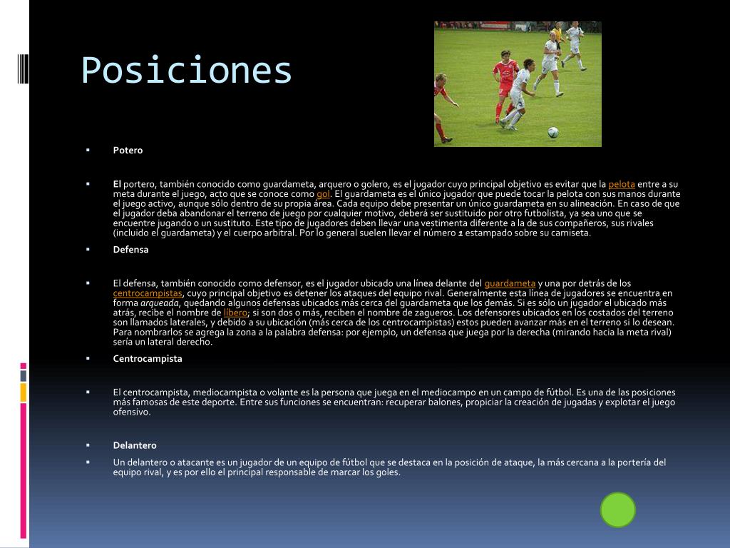 Posiciones • Potero • Elportero, también conocido como guardameta, arquero o golero, es el jugador cuyo principal objetivo es evitar que la pelota entre a su meta durante el juego, acto que se conoce como gol. El guardameta es el único jugador que puede tocar la pelota con sus manos durante el juego activo, aunque sólo dentro de su propia área. Cada equipo debe presentar un único guardameta en su alineación. En caso de que el jugador deba abandonar el terreno de juego por cualquier motivo, deberá ser sustituido por otro futbolista, ya sea uno que se encuentre jugando o un sustituto. Este tipo de jugadores deben llevar una vestimenta diferente a la de sus compañeros, sus rivales (incluido el guardameta) y el cuerpo arbitral. Por lo general suelen llevar el número 1 estampado sobre su camiseta. • Defensa • El defensa, también conocido como defensor, es el jugador ubicado una línea delante del guardameta y una por detrás de los centrocampistas, cuyo principal objetivo es detener los ataques del equipo rival. Generalmente esta línea de jugadores se encuentra en forma arqueada, quedando algunos defensas ubicados más cerca del guardameta que los demás. Si es sólo un jugador el ubicado más atrás, recibe el nombre de líbero; si son dos o más, reciben el nombre de zagueros. Los defensores ubicados en los costados del terreno son llamados laterales, y debido a su ubicación (más cerca de los centrocampistas) estos pueden avanzar más en el terreno si lo desean. Para nombrarlos se agrega la zona a la palabra defensa: por ejemplo, un defensa que juega por la derecha (mirando hacia la meta rival) sería un lateral derecho. • Centrocampista • El centrocampista, mediocampista o volante es la persona que juega en el mediocampo en un campo de fútbol. Es una de las posiciones más famosas de este deporte. Entre sus funciones se encuentran: recuperar balones, propiciar la creación de jugadas y explotar el juego ofensivo. • Delantero • Un delantero o atacante es un jugador de un equipo de fútbol que se destaca en la posición de ataque, la más cercana a la portería del equipo rival, y es por ello el principal responsable de marcar los goles.